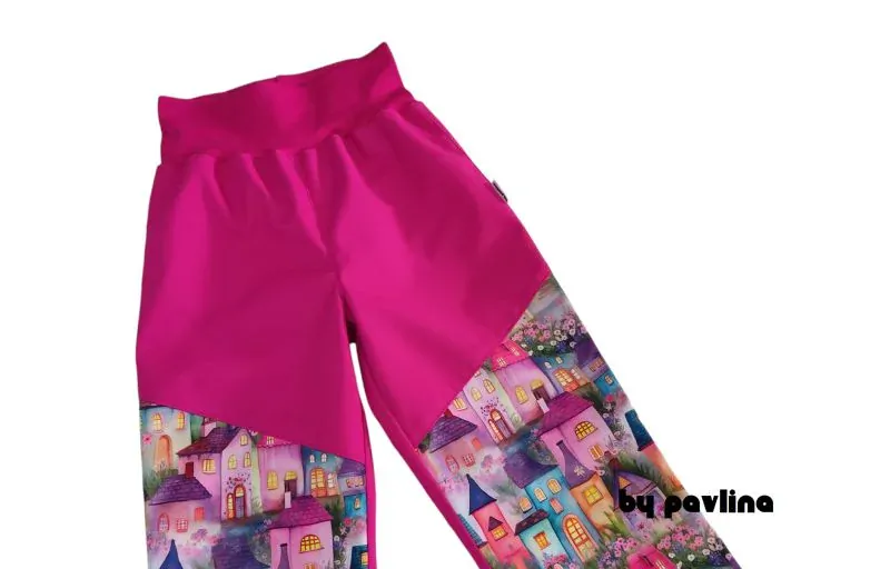 Dívčí jarní - podzimní rostoucí softshellové kalhoty - Malina + Růžové domečkySkladem 2 kscena od 495 Kč/ ks